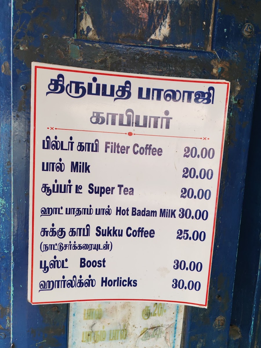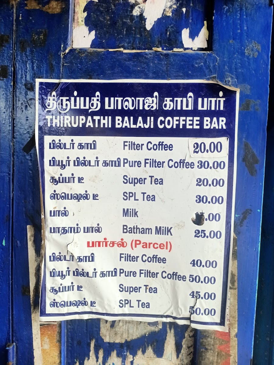 Welcome to Thirupathi Balaji Coffee Bar, a hidden gem nestled in Kanchipuram, Tamil Nadu. Located at 93, Kamarajar St, Ennaikaran, this quaint café has garnered a loyal following for its exceptional offerings of traditional South Indian coffee and tea. The menu is simple yet delightful, with coffee priced at just ₹15 and tea at ₹20, making it accessible for everyone.